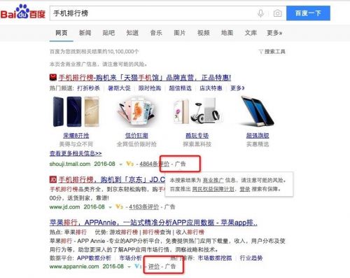作為受影響最大的百度搜索,TechWeb查詢發現,目前百度的搜索結果頁面的廣告樣式已經由原來的“商業推廣”變成“廣告”二字描述了。